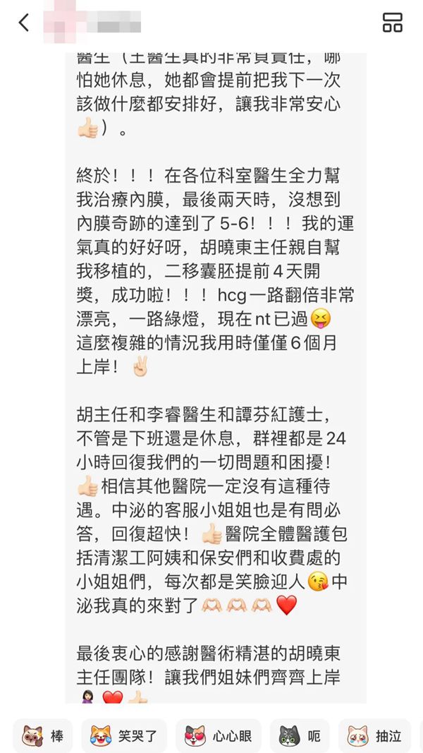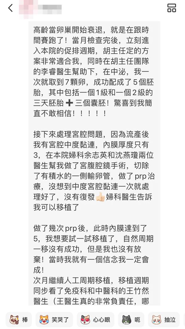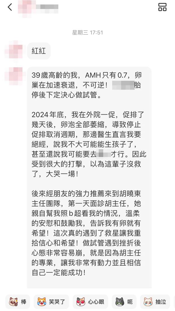 第一次见面,胡晓东主任就给了她完全不同的体验:"胡主任亲自帮我照B超,温柔地安慰和鼓励我,告诉我有卵就有希望!"