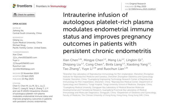 深圳中山妇产医院生殖免疫科连若纯主任和生殖医学临床研究中心陈现博士团队的最新临床研究证实:自体富血小板血浆(PRP)宫腔灌注治疗,能够显著改善顽固性CE患者的子宫内膜环境,大幅提高妊娠成功率!目前该研究已发表在免疫学领域知名期刊《Frontiers in Immunology》,为全球难治性CE治疗提供了新的理论依据和新方向!
