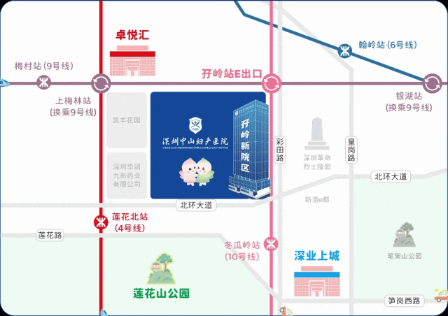 新院区紧邻地铁9号线(梅林线) / 10号线(坂田线)的孖岭站。