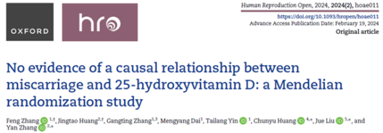 [1]Zhang F, Huang J, Zhang G, Dai M, Yin T, Huang C, Liu J, Zhang Y. No evidence of a causal relationship between miscarriage and 25-hydroxyvitamin D: a Mendelian randomization study. Hum Reprod Open 2024;2024:hoae011.