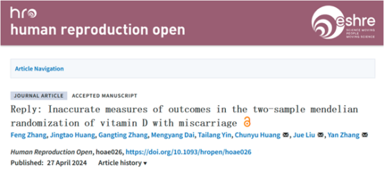 [2] Zhang F, Huang J, Zhang G, Dai M, Yin T, Huang C, Liu J, Zhang Y. Reply: Inaccurate measures of outcomes in the two-sample mendelian randomization of vitamin D with miscarriage. Hum Reprod Open 2024;2024:hoae026.