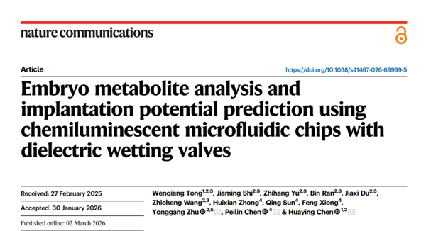 近日,我院生殖医学临床研究中心陈培林、钟惠娴,生殖中心胚胎培养室孙青、熊风与哈尔滨工业大学(深圳)陈华英教授、朱永刚教授团队合作完成的研究论文,在Nature旗下综合学术期刊Nature Communications(IF= 15.7)上发表题为"Embryo metabolite analysis and implantation potential prediction using chemiluminescent microfluidic chips with dielectric wetting valves"的研究型论文。