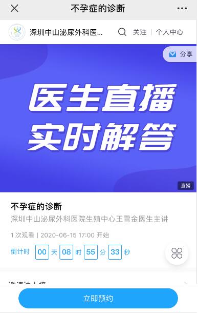 备孕好几年仍没能要上宝宝,一直以为是女方的问题,检查之后发现男方也“难逃其咎”。患上了不孕症,我应该怎么办?我想生个娃还能有希望吗?今天下午17:00,深圳中山妇产医院生殖助孕中心王雪金医生将为大家在线讲解《不孕症的诊断》,敬请关注!